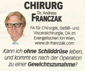 Dr. med. Andreas Franczak is a specialist in Vienna and offers medicinal goiter treatments up to professional thyroidectomy. The practice can be found at Lazarettgasse 16-18 in 1090 Vienna. For quick and flexible appointment scheduling: